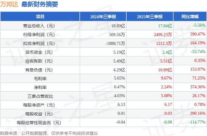 据证券之星公开数据整理,近期万邦达(300055)发布2025年三季报。截至本报告期末,公司营业总收入17.84亿元,同比下降5.56%,归母净利润2499.23万元,同比上升390.47%。按单季度数据看,第三季度营业总收入5.97亿元,同比下降5.4%,第三季度归母净利润248.78万元,同比上升114.3%。本报告期万邦达盈利能力上升,毛利率同比增幅71.25%,净利率同比增幅374.36%。