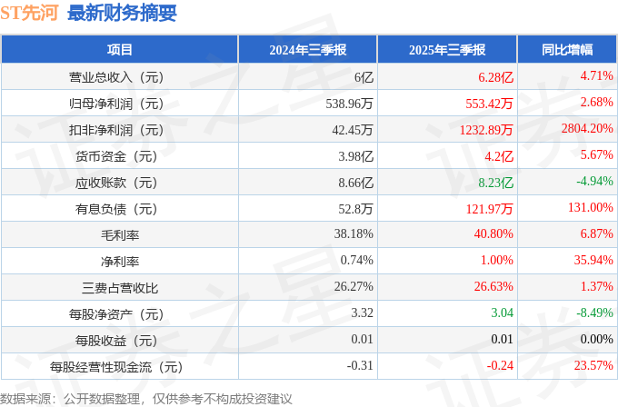 据证券之星公开数据整理,近期ST先河(300137)发布2025年三季报。截至本报告期末,公司营业总收入6.28亿元,同比上升4.71%,归母净利润553.42万元,同比上升2.68%。按单季度数据看,第三季度营业总收入2.11亿元,同比上升2.08%,第三季度归母净利润-1892.69万元,同比下降42.5%。本报告期ST先河盈利能力上升,毛利率同比增幅6.87%,净利率同比增幅35.94%。