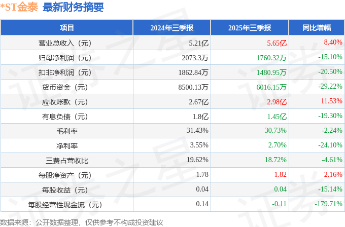 据证券之星公开数据整理,近期*ST金泰(300225)发布2025年三季报。截至本报告期末,公司营业总收入5.65亿元,同比上升8.4%,归母净利润1760.32万元,同比下降15.1%。按单季度数据看,第三季度营业总收入1.99亿元,同比上升13.85%,第三季度归母净利润889.47万元,同比上升14.94%。本报告期*ST金泰公司应收账款体量较大,当期应收账款占最新年报归母净利润比达962.8%。