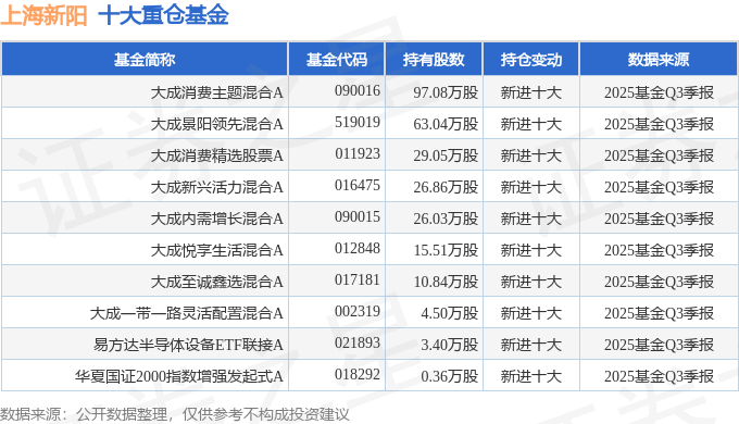 持有上海新阳最多的基金为大成消费主题混合A,目前规模为7.74亿元,最新净值2.0994(10月30日),较上一交易日下跌2.1%,近一年上涨13.15%。该基金现任基金经理为齐炜中。