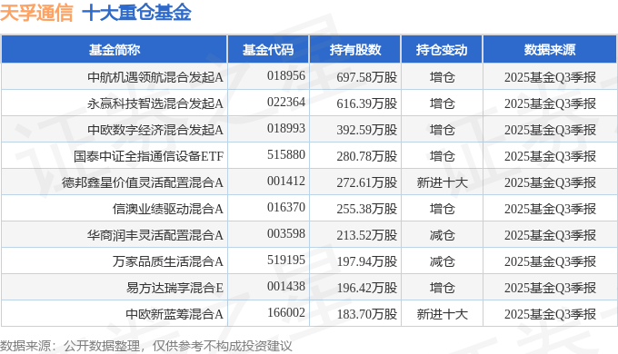 持有天孚通信最多的基金为中航机遇领航混合发起A,目前规模为18.81亿元,最新净值3.19(10月30日),较上一交易日下跌3.72%,近一年上涨139.44%。该基金现任基金经理为韩浩。