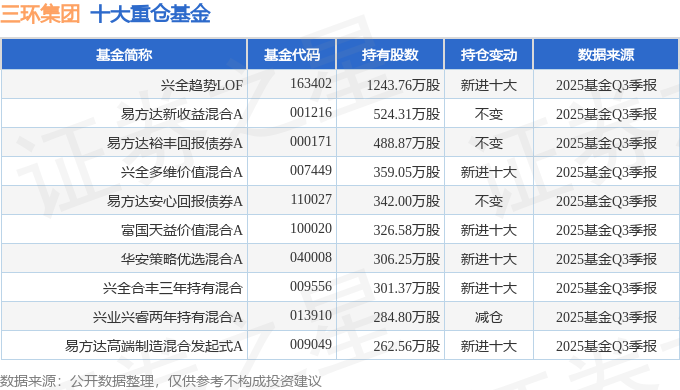 持有三环集团最多的基金为兴全趋势LOF,目前规模为151.39亿元,最新净值0.7189(10月30日),较上一交易日下跌1.66%,近一年上涨19.62%。该基金现任基金经理为杨世进 谢长雁。