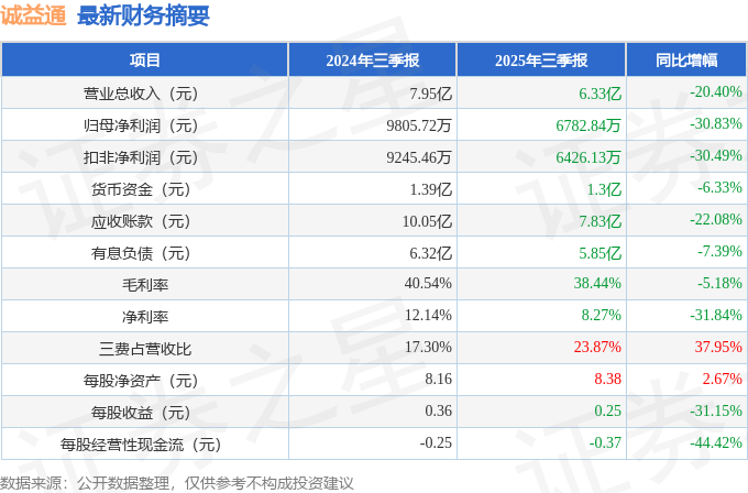 据证券之星公开数据整理,近期诚益通(300430)发布2025年三季报。截至本报告期末,公司营业总收入6.33亿元,同比下降20.4%,归母净利润6782.84万元,同比下降30.83%。按单季度数据看,第三季度营业总收入2.25亿元,同比上升48.67%,第三季度归母净利润1665.09万元,同比上升14.92%。本报告期诚益通三费占比上升明显,财务费用、销售费用和管理费用总和占总营收同比增幅达37.95%。
