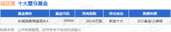 持有诚益通最多的基金为长城消费增值混合A,目前规模为5.16亿元,最新净值1.164(10月30日),较上一交易日下跌0.42%,近一年上涨16.58%。该基金现任基金经理为龙宇飞。