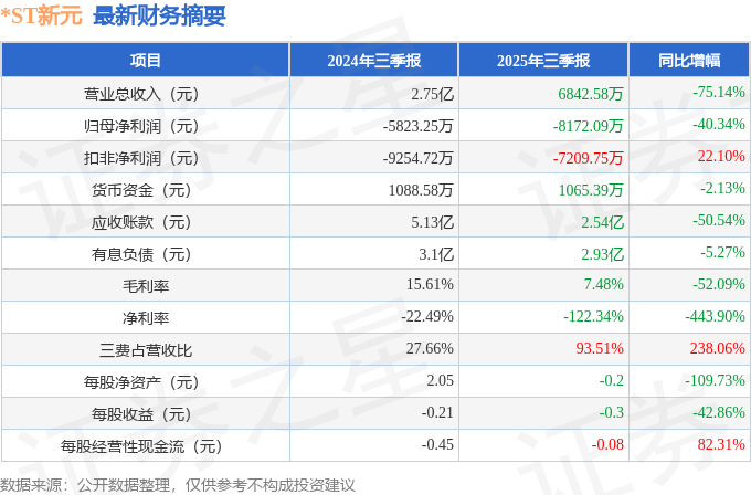据证券之星公开数据整理,近期*ST新元(300472)发布2025年三季报。截至本报告期末,公司营业总收入6842.58万元,同比下降75.14%,归母净利润-8172.09万元,同比下降40.34%。按单季度数据看,第三季度营业总收入6200.3万元,同比下降60.82%,第三季度归母净利润-1665.54万元,同比上升21.31%。本报告期*ST新元三费占比上升明显,财务费用、销售费用和管理费用总和占总营收同比增幅达238.06%。