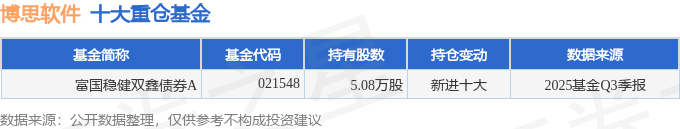 持有博思软件最多的基金为富国稳健双鑫债券A,目前规模为2.24亿元,最新净值1.0646(10月30日),较上一交易日下跌0.04%,近一年上涨5.16%。该基金现任基金经理为朱晨杰。