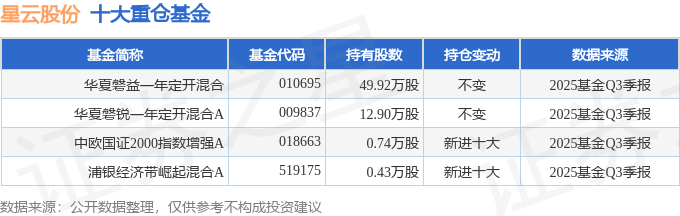 持有星云股份最多的基金为华夏磐益一年定开混合,目前规模为5.4亿元,最新净值1.4338(10月30日),较上一交易日下跌0.54%,近一年上涨34.05%。该基金现任基金经理为张城源。