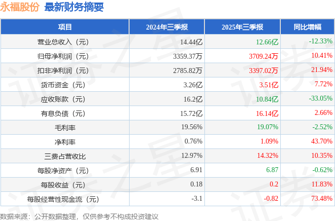 据证券之星公开数据整理,近期永福股份(300712)发布2025年三季报。截至本报告期末,公司营业总收入12.66亿元,同比下降12.33%,归母净利润3709.24万元,同比上升10.41%。按单季度数据看,第三季度营业总收入2.89亿元,同比下降35.53%,第三季度归母净利润583.18万元,同比上升77.73%。本报告期永福股份公司应收账款体量较大,当期应收账款占最新年报归母净利润比达2987.31%。