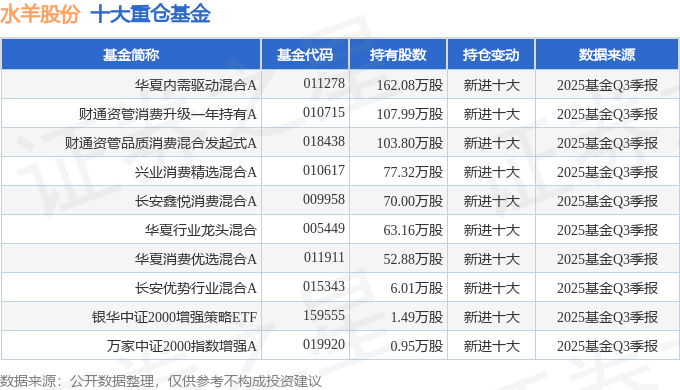 持有水羊股份最多的基金为华夏内需驱动混合A,目前规模为13.65亿元,最新净值0.5586(10月29日),较上一交易日上涨0.7%,近一年上涨7.05%。该基金现任基金经理为季新星 徐漫。