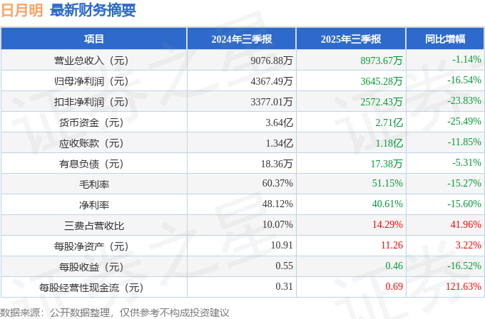 据证券之星公开数据整理,近期日月明(300906)发布2025年三季报。截至本报告期末,公司营业总收入8973.67万元,同比下降1.14%,归母净利润3645.28万元,同比下降16.54%。按单季度数据看,第三季度营业总收入4128.55万元,同比上升37.27%,第三季度归母净利润1459.3万元,同比下降2.56%。本报告期日月明三费占比上升明显,财务费用、销售费用和管理费用总和占总营收同比增幅达41.96%。