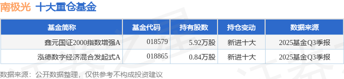 持有南极光最多的基金为鑫元国证2000指数增强A,目前规模为0.94亿元,最新净值1.3478(10月30日),较上一交易日下跌1.08%,近一年上涨37.43%。该基金现任基金经理为刘宇涛。