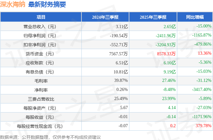 据证券之星公开数据整理,近期深水海纳(300961)发布2025年三季报。截至本报告期末,公司营业总收入2.65亿元,同比下降15.0%,归母净利润-2411.96万元,同比下降1165.87%。按单季度数据看,第三季度营业总收入9891.6万元,同比下降5.22%,第三季度归母净利润-844.34万元,同比下降282.51%。本报告期深水海纳公司应收账款体量较大,当期应收账款占最新年报营业总收入比达165.76%。