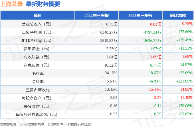 据证券之星公开数据整理,近期上海艾录(301062)发布2025年三季报。截至本报告期末,公司营业总收入8.82亿元,同比上升0.75%,归母净利润-4797.34万元,同比下降175.66%。按单季度数据看,第三季度营业总收入2.95亿元,同比下降2.69%,第三季度归母净利润-5088.87万元,同比下降532.82%。本报告期上海艾录公司应收账款体量较大,当期应收账款占最新年报归母净利润比达541.31%。