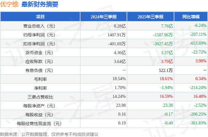 据证券之星公开数据整理,近期优宁维(301166)发布2025年三季报。根据财报显示,优宁维净利润同比下降207.11%。截至本报告期末,公司营业总收入7.76亿元,同比下降6.24%,归母净利润-1507.96万元,同比下降207.11%。按单季度数据看,第三季度营业总收入2.71亿元,同比下降1.45%,第三季度归母净利润-169.97万元,同比下降67.29%。