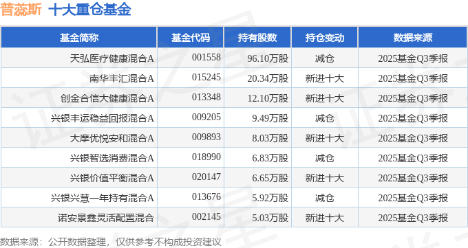 持有普蕊斯最多的基金为天弘医疗健康混合A,目前规模为2.63亿元,最新净值1.7223(10月30日),较上一交易日下跌1.37%,近一年下跌6.15%。该基金现任基金经理为吕俏。