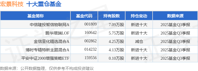 持有宏景科技最多的基金为中信建投智信物联网A,目前规模为1.41亿元,最新净值1.2163(10月30日),较上一交易日下跌1.49%,近一年下跌12.75%。该基金现任基金经理为周紫光。