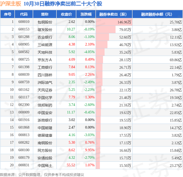 沪深主板融券净卖出前三分别为:包钢股份(600010)融券净卖出146.96万股、建发股份(600153)融券净卖出79.05万股、农业银行(601288)融券净卖出52.6万股,前20具体见下表: