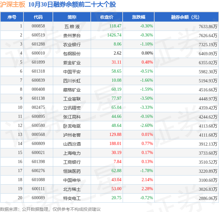 沪深主板融券余额前三分别为:五 粮 液(000858)融券余额7633.86万元、贵州茅台(600519)融券余额7626.64万元、农业银行(601288)融券余额7325.19万元,前20具体见下表: