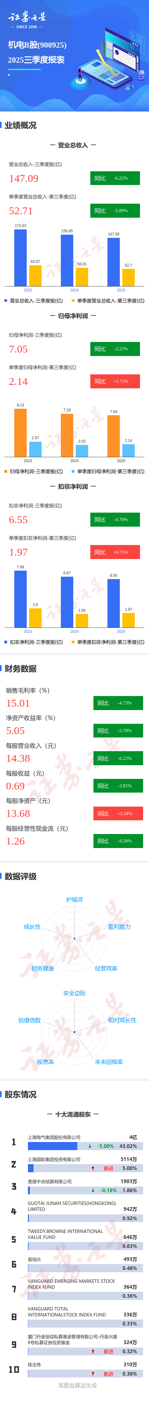 证券之星消息,机电B股2025年三季报显示,前三季度公司主营收入147.09亿元,同比下降6.22%;归母净利润7.05亿元,同比下降3.23%;扣非净利润6.55亿元,同比下降4.71%;其中2025年第三季度,公司单季度主营收入52.71亿元,同比下降5.89%;单季度归母净利润2.14亿元,同比上升5.71%;单季度扣非净利润1.97亿元,同比上升6.76%;负债率51.72%,投资收益3.2亿元,财务费用-1.72亿元,毛利率15.01%。
