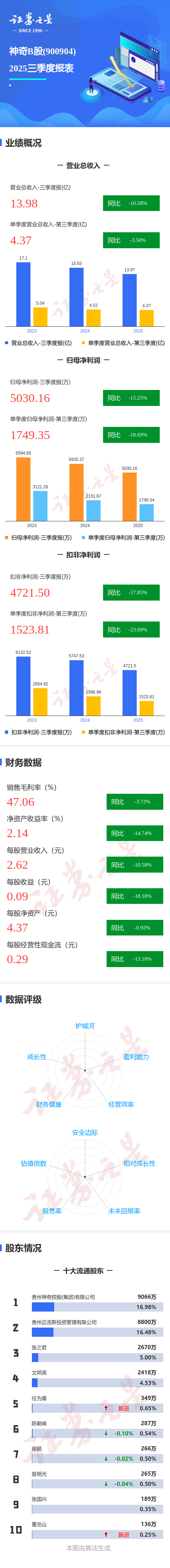 证券之星消息,神奇B股2025年三季报显示,前三季度公司主营收入13.98亿元,同比下降10.58%;归母净利润5030.16万元,同比下降15.25%;扣非净利润4721.5万元,同比下降17.85%;其中2025年第三季度,公司单季度主营收入4.37亿元,同比下降3.51%;单季度归母净利润1749.35万元,同比下降18.7%;单季度扣非净利润1523.81万元,同比下降23.69%;负债率21.93%,财务费用148.98万元,毛利率47.06%。