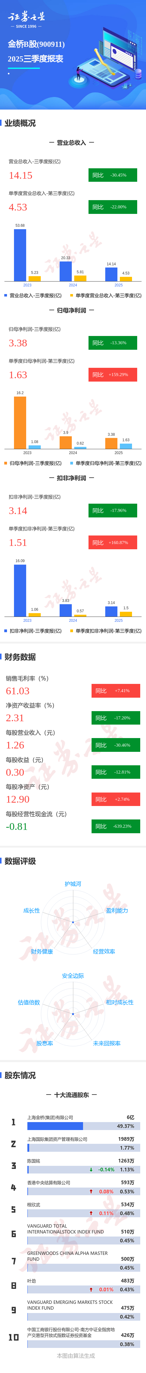 证券之星消息,金桥B股2025年三季报显示,前三季度公司主营收入14.15亿元,同比下降30.46%;归母净利润3.38亿元,同比下降13.36%;扣非净利润3.14亿元,同比下降17.97%;其中2025年第三季度,公司单季度主营收入4.53亿元,同比下降22.0%;单季度归母净利润1.63亿元,同比上升159.29%;单季度扣非净利润1.51亿元,同比上升160.88%;负债率62.62%,投资收益3971.84万元,财务费用2.8亿元,毛利率61.03%。