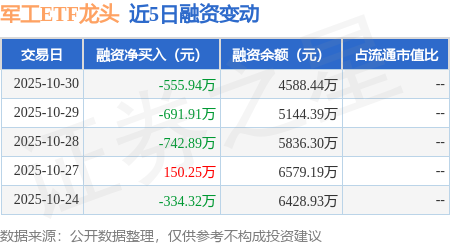 证券之星消息,10月30日,军工ETF龙头(512680)融资买入562.8万元,融资偿还1118.75万元,融资净卖出555.94万元,融资余额4588.44万元。