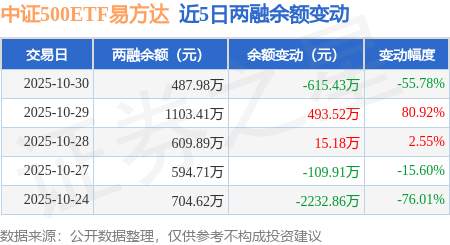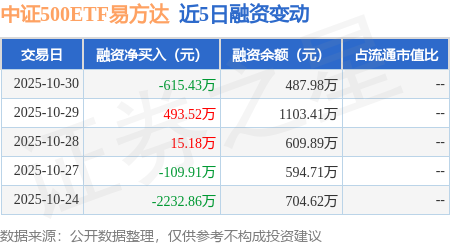 证券之星消息,10月30日,中证500ETF易方达(510580)融资买入116.09万元,融资偿还731.51万元,融资净卖出615.43万元,融资余额487.98万元,近20个交易日中有11个交易日出现融资净买入。