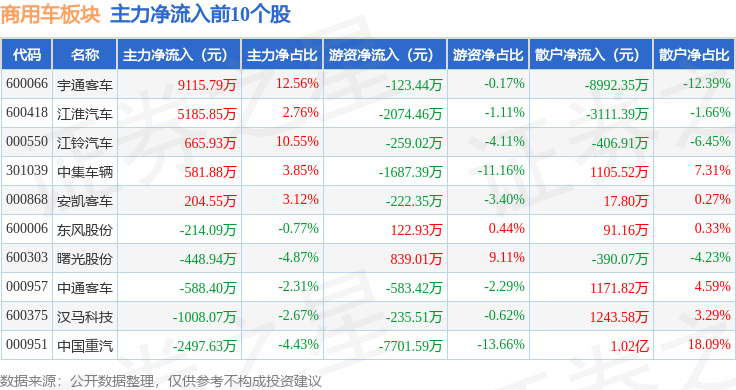 从资金流向上来看,当日商用车板块主力资金净流出1.74亿元,游资资金净流出1.67亿元,散户资金净流入3.42亿元。商用车板块个股资金流向见下表:
