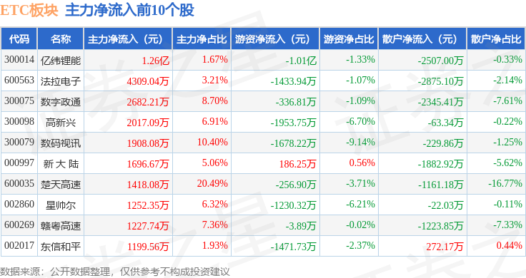从资金流向上来看,当日ETC板块主力资金净流出18.17亿元,游资资金净流入1.95亿元,散户资金净流入16.22亿元。ETC板块个股资金流向见下表: