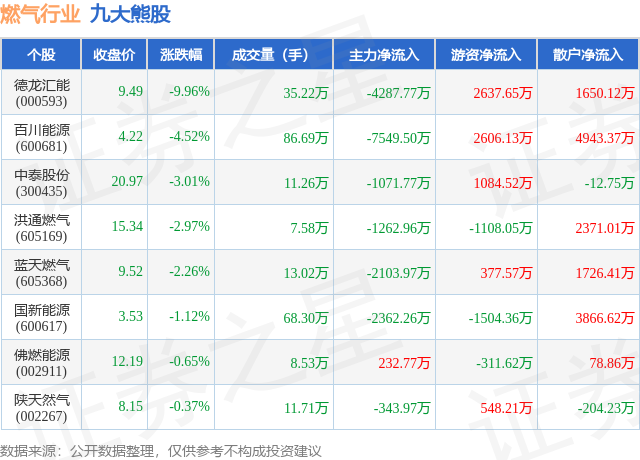 个股表现方面,燃气行业当日领跌股为德龙汇能(000593),该股当日报收9.49,下跌9.96%,成交量35.22万,主力资金净流出4287.77万元。百川能源(600681)以下跌4.52%紧随其后,该股当日成交量86.69万,主力资金净流出7549.5万元。除此之外,中泰股份(300435)、洪通燃气(605169)、蓝天燃气(605368)均进入当日熊股之列。具体个股列表见下表: