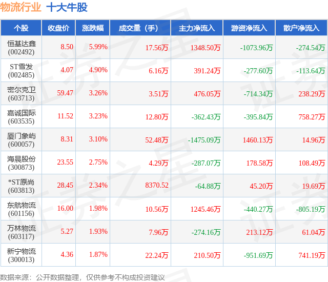 个股表现方面,物流行业当日领涨股为恒基达鑫(002492),该股当日报收8.5,上涨5.99%,成交量17.56万,主力资金净流入1348.5万元。ST雪发(002485)以上涨4.9%紧随其后,该股当日成交量6.16万,主力资金净流入391.24万元。除此之外,密尔克卫(603713)、嘉诚国际(603535)、厦门象屿(600057)均进入当日牛股之列。具体个股列表见下表: