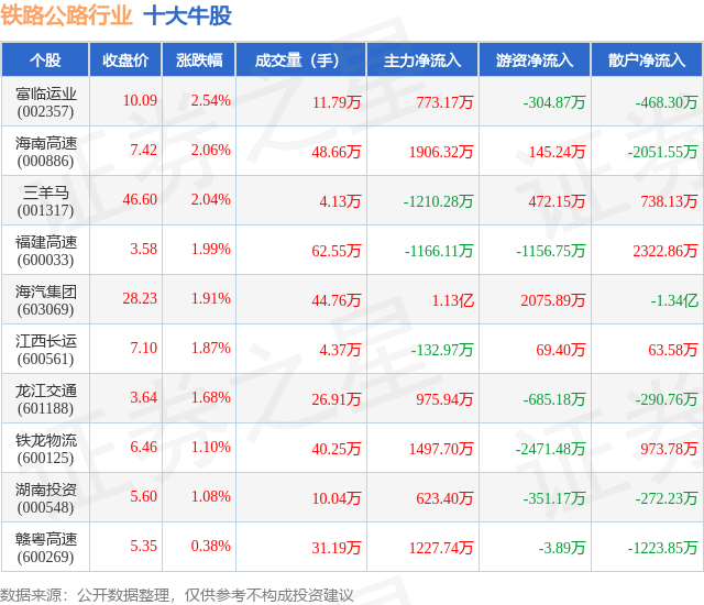 个股表现方面,铁路公路行业当日领涨股为富临运业(002357),该股当日报收10.09,上涨2.54%,成交量11.79万,主力资金净流入773.17万元。海南高速(000886)以上涨2.06%紧随其后,该股当日成交量48.66万,主力资金净流入1906.32万元。除此之外,三羊马(001317)、福建高速(600033)、海汽集团(603069)均进入当日牛股之列。具体个股列表见下表: