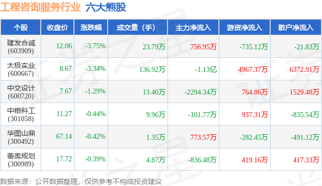 个股表现方面,工程咨询服务行业当日领跌股为建发合诚(603909),该股当日报收12.06,下跌3.75%,成交量23.79万,主力资金净流入756.95万元。太极实业(600667)以下跌3.34%紧随其后,该股当日成交量136.92万,主力资金净流出1.13亿元。除此之外,中交设计(600720)、中粮科工(301058)、华图山鼎(300492)均进入当日熊股之列。具体个股列表见下表: