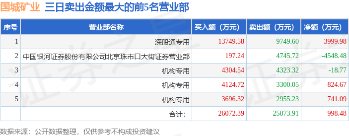 证券之星消息,沪深交易所2025年10月31日公布的交易公开信息显示,国城矿业(000688)因连续三个交易日内,涨幅偏离值累计达到20%的证券登上龙虎榜。此次是近5个交易日内第1次上榜。