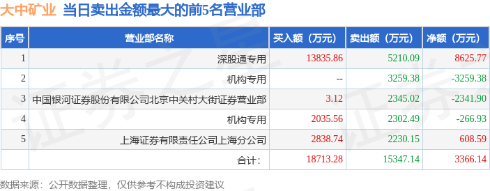 证券之星消息,沪深交易所2025年10月31日公布的交易公开信息显示,大中矿业(001203)因日涨幅偏离值达到7%的前5只证券登上龙虎榜。此次是近5个交易日内第2次上榜。