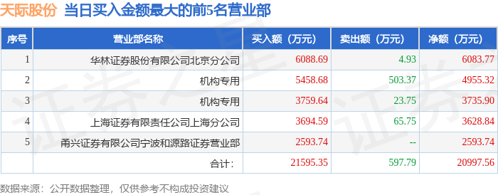 证券之星消息,沪深交易所2025年10月31日公布的交易公开信息显示,天际股份(002759)因日涨幅偏离值达到7%的前5只证券登上龙虎榜。此次是近5个交易日内第3次上榜。