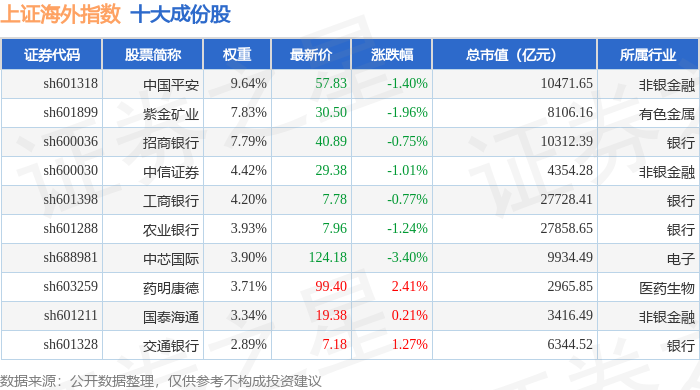 证券之星消息,10月31日,上证海外(000054)指数报收于1559.3点,跌1.24%,成交1189.58亿元,换手率0.47%。当日该指数成份股中,上涨的有14家,中国中免以4.06%的涨幅领涨,下跌的有52家,中国国航以8.07%的跌幅领跌。