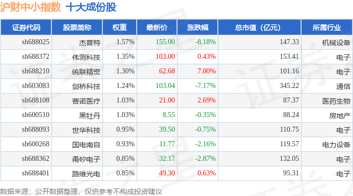 证券之星消息,10月31日,沪财中小(000091)指数报收于14405.15点,涨0.47%,成交530.93亿元,换手率2.77%。当日该指数成份股中,上涨的有127家,联环药业以10.01%的涨幅领涨,下跌的有67家,杰普特以8.18%的跌幅领跌。