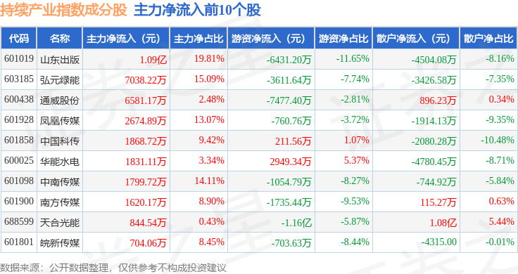 资金流向方面,持续产业(000114)指数成份股当日主力资金净流出合计31.05亿元,游资资金净流入合计7.56亿元,散户资金净流入合计23.49亿元。成份股资金流向详情见下表: