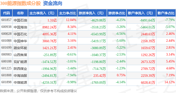 资金流向方面,300能源(000908)指数成份股当日主力资金净流入合计2.02亿元,游资资金净流出合计2.77亿元,散户资金净流入合计7474.14万元。成份股资金流向详情见下表: