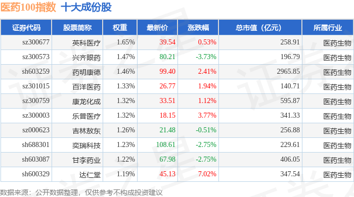 医药100(000978)指数十大成份股详情如下: