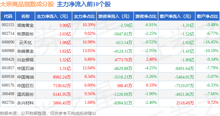 资金流向方面,大宗商品(000979)指数成份股当日主力资金净流出合计72.73亿元,游资资金净流入合计19.83亿元,散户资金净流入合计52.9亿元。成份股资金流向详情见下表: