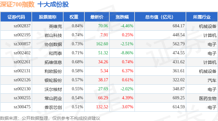 证券之星消息,10月31日,深证700(399010)指数报收于8639.91点,涨0.6%,成交3722.61亿元,换手率3.59%。当日该指数成份股中,上涨的有462家,华兰疫苗以17.88%的涨幅领涨,下跌的有222家,鼎泰高科以10.68%的跌幅领跌。