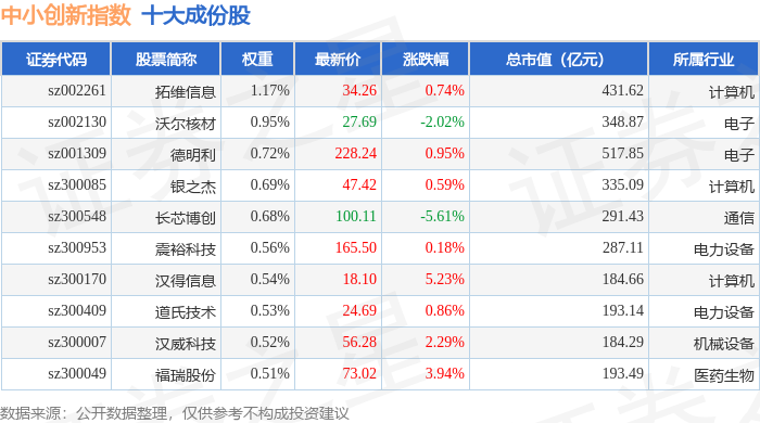 中小创新(399015)指数十大成份股详情如下: