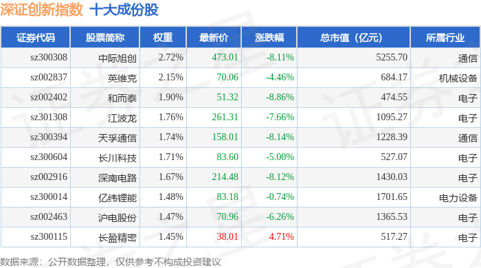 证券之星消息,10月31日,深证创新(399016)指数报收于5694.89点,跌1.38%,成交2169.88亿元,换手率3.05%。当日该指数成份股中,上涨的有49家,海思科以10.0%的涨幅领涨,下跌的有51家,和而泰以8.86%的跌幅领跌。