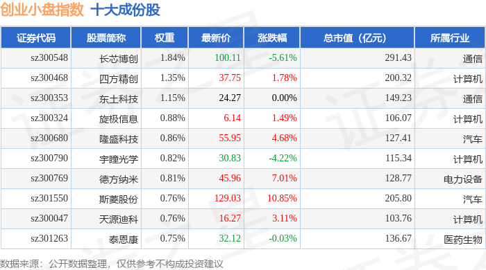 证券之星消息,10月31日,创业小盘(399020)指数报收于1739.23点,涨0.85%,成交877.2亿元,换手率4.05%。当日该指数成份股中,上涨的有232家,舒泰神以19.99%的涨幅领涨,下跌的有66家,鼎泰高科以10.68%的跌幅领跌。