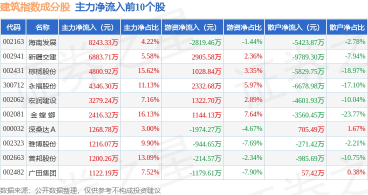 资金流向方面,建筑指数(399235)成份股当日主力资金净流入合计6898.59万元,游资资金净流入合计8569.29万元,散户资金净流出合计1.55亿元。成份股资金流向详情见下表:
