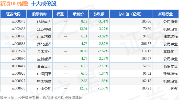 证券之星消息,10月31日,新浪100(399297)指数报收于6046.53点,涨0.53%,成交185.21亿元,换手率2.36%。当日该指数成份股中,上涨的有68家,赛升药业以6.77%的涨幅领涨,下跌的有28家,皖能电力以3.31%的跌幅领跌。