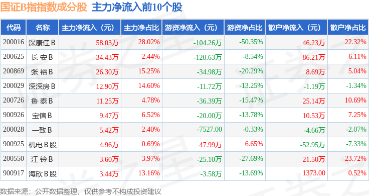 资金流向方面,国证B指(399318)指数成份股当日主力资金净流出合计878.5万元,游资资金净流出合计15.32万元,散户资金净流入合计893.82万元。成份股资金流向详情见下表:
