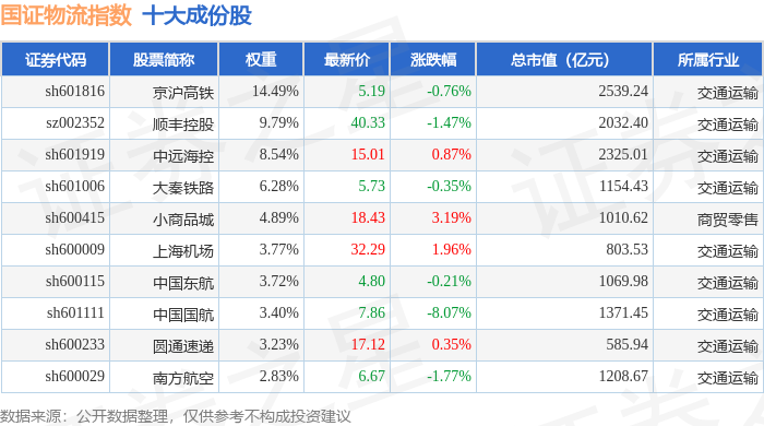 资金流向方面,国证物流(399353)指数成份股当日主力资金净流出合计1.1亿元,游资资金净流入合计9586.84万元,散户资金净流入合计1377.24万元。成份股资金流向详情见下表: